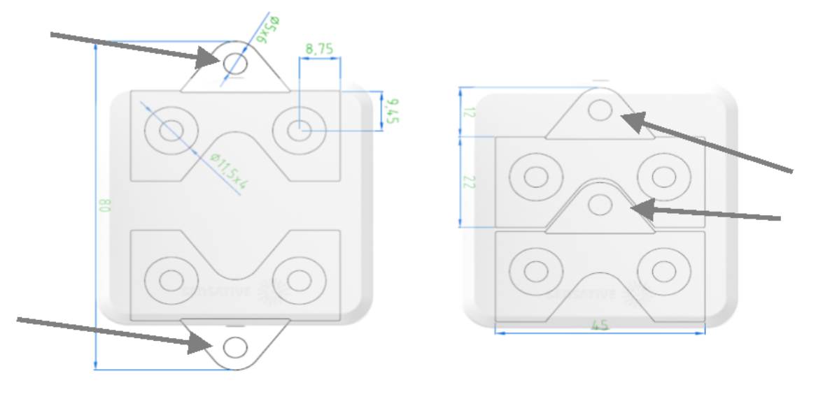 Figure 3: Adhesive plates for mounting with screws. Use the holes pointed out for adjacent or hidden screw installation.
